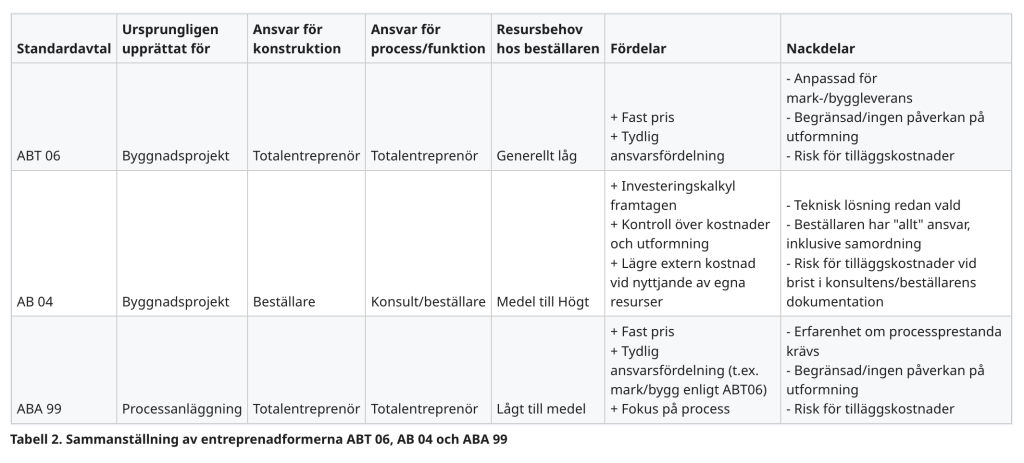 Lämplig entreprenadform utifrån projekttyp och beställarens vilja till ansvar och risktagande sammanfattas i tabellen nedan. Tabellen kommer från SVU-rapporten 2019-23 där Vattenindustrin är medförfattare.
